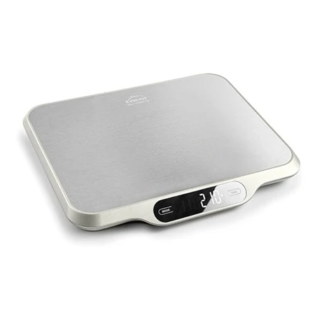 Cette balance de cuisine électronique d’une capacité maximum de 15 kg va vous permettre d’obtenir des résultats de pesés très précis ! Compacte et extra-plate, elle vous confère un gain d’espace et de rangement puisque celle-ci ne prendra pas plus de place qu’un livre une fois rangée verticalement. Robuste, la plateforme de pesage est fabriquée en acier inoxydable de la plus grande qualité. Moderne, elle dispose de 4 capteurs de grande précision d’une exactitude maximale au gramme près, d’une fonction d’arrêt automatique (60 secs) pour économiser l’énergie et enfin d’une fonction tare pour peser directement dans vos bols de préparation. Affichage sur écran LCD tactile très design qui affiche le poids total de l’aliment.