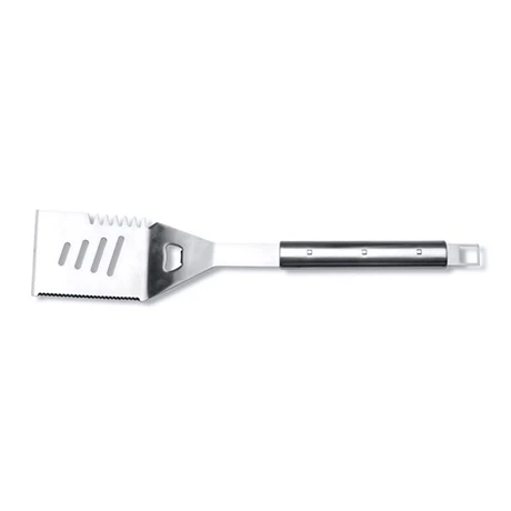 – La longue et large lame de la spatule perforée vous permettra de passer de soulever les aliments les plus délicats, comme du poisson, qui se casseraient si vous utilisiez la pince. Encore une fois, la poignée est longue pour garder vos mains loin de la surface chaude.