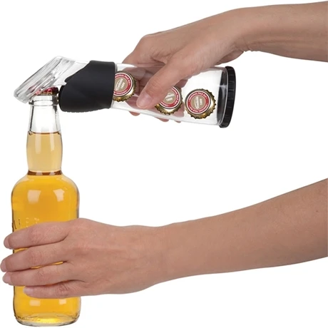 Pratique et ingénieux, cet ouvre bouteille avec contenant à capsules Trudeau ouvre les bouteilles de soda, de bière, de jus de fruits sans effort et retient la capsule dans son compartiment transparent.