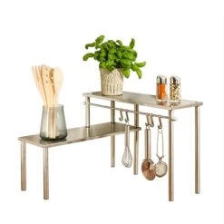 Pour une utilisation optimale des angles de votre plan de travail, découvrez l’étagère d’angle de 2 niveaux en acier inoxydable ! Cette étagère d’angle vous assure un plan de travail organisé, et augmente l’espace disponible. Deux plans de rangement sont disponibles ainsi qu’une barre comportant 5 crochets pour vos ustensiles de cuisine.