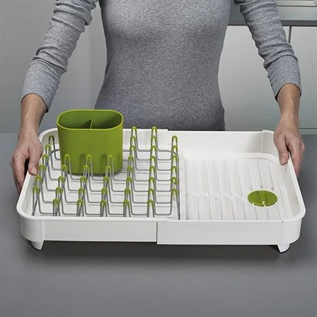 L’égouttoir extensible blanc Extend™ de Joseph Joseph vous permet d’augmenter facilement et rapidement votre espace pour égoutter votre vaisselle. Sa taille peut presque doubler si besoin pour égoutter la vaisselle d’une seule personne ou bien de toute une famille. Un bec verseur intégré évacue l’eau en excédent, mais celui-ci peut être fermé et rangé pour retenir l’eau.