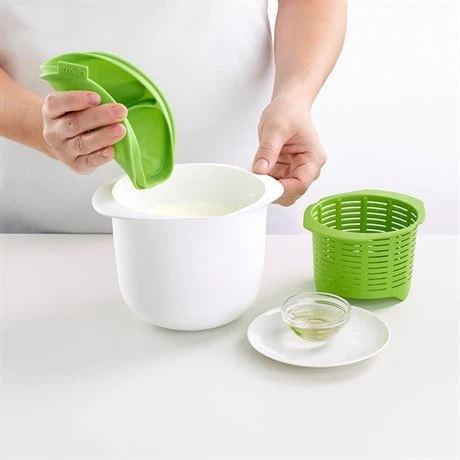 Le couvercle flexible en silicone comprend un doseur pour le liquide acide (citron, vinaigre…), la passoire possède des pieds pour égoutter facilement le fromage et le bol en polyester passe au micro-ondes pour une cuisson rapide.