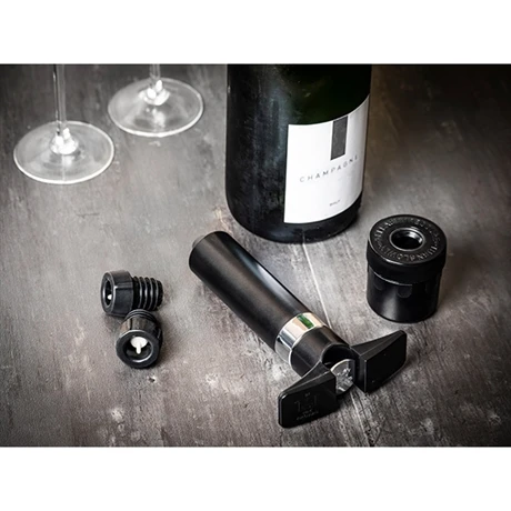 Contient une pompe double fonction, 2 bouchons Ă vins et un bouchon Ă Champagne.