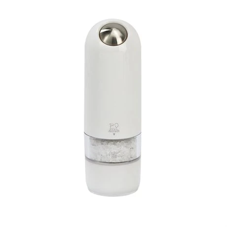 Design résolument contemporain pour ce moulin à sel Alaska 17 cm à la fois ludique et vintage, avec sa forme galbée et son bouton tout en rondeur. En plastique et métal pour un mélange harmonieux et ergonomique. Ingénieux : s’utilise d’une seule main, une lampe à la base permet de contrôler le dosage, et un réservoir transparent indique le niveau de remplissage.